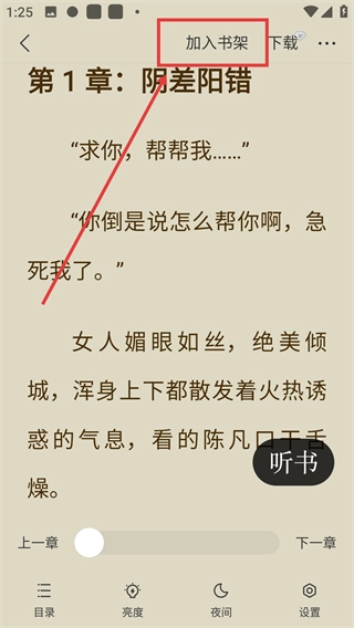 2、进入阅读界面后,点击顶部的【加入书架】按钮,就能把这本小说收藏到你的书架里,这样后续想继续阅读时就更方便啦。