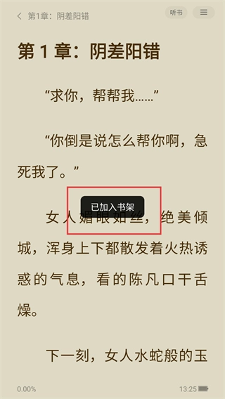 3、点击【加入书架】后,界面会弹出【已加入书架】的提示,这就意味着该小说已经成功收藏到书架了。