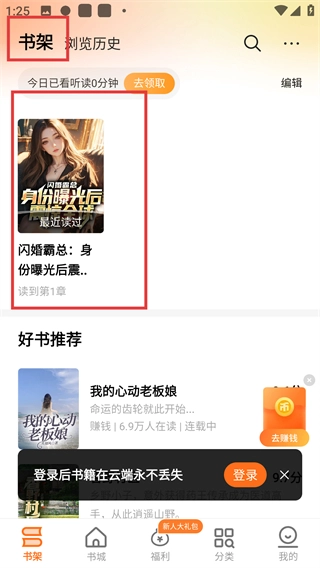 4、回到底部的【书架】页面,就能看到刚收藏的小说,点击就能直接进入阅读界面,继续阅读之前的内容啦。