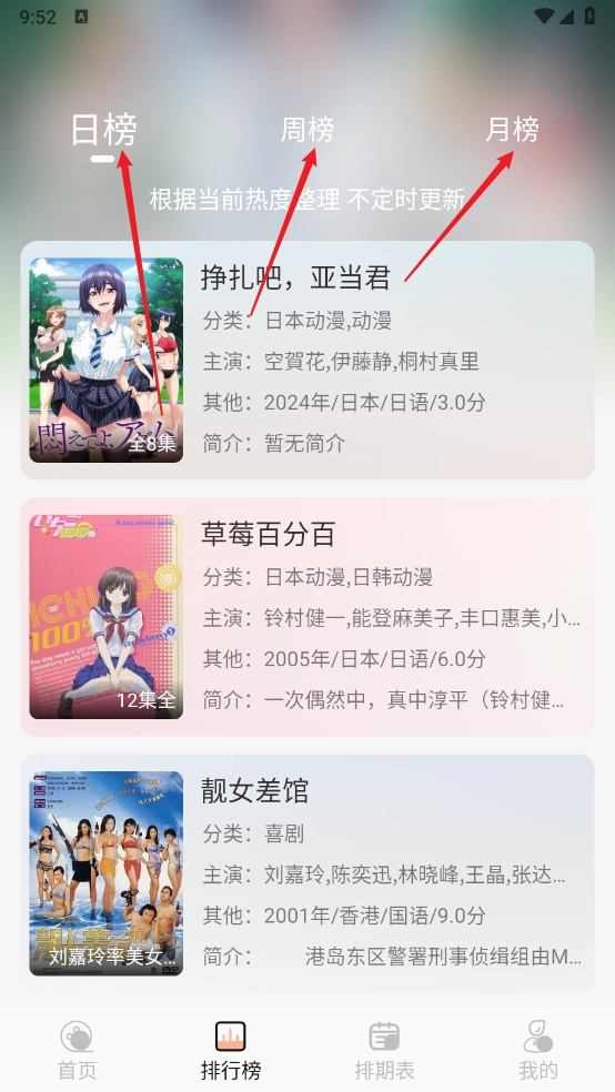 6、进入“排行榜”板块,这里设有日榜、周榜与月榜,你可以随时在其中查看各个榜单的相关信息。