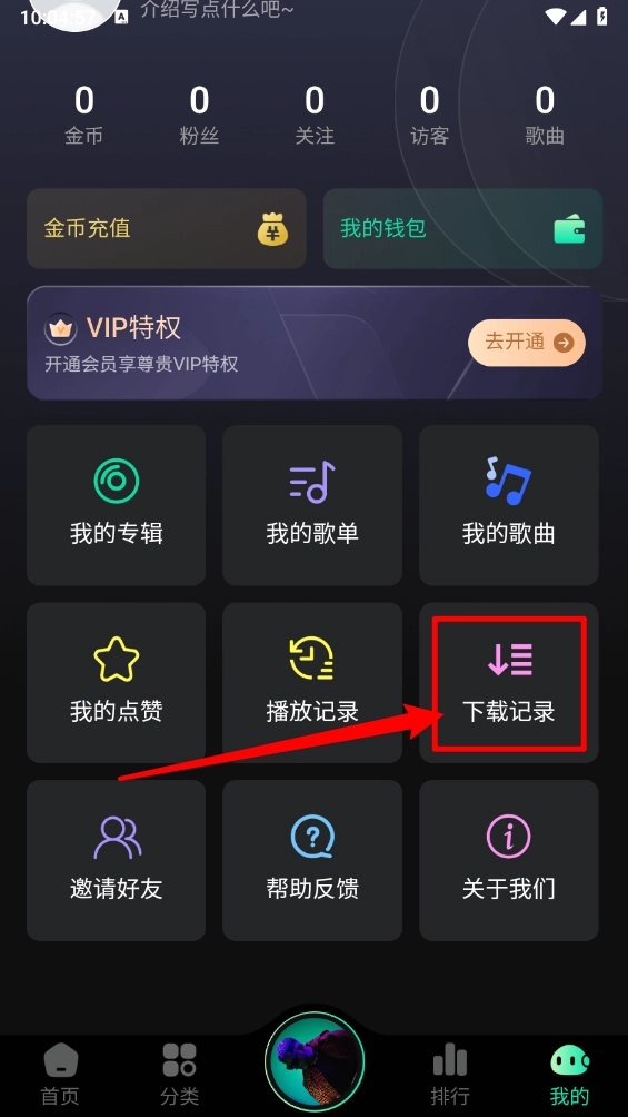 5、最后进入我的页面,点击“记录”选项进入,就能查询到歌曲了。