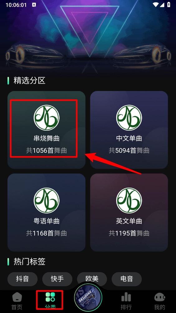 1、进入"分类"板块,比如点击"串烧舞曲"。