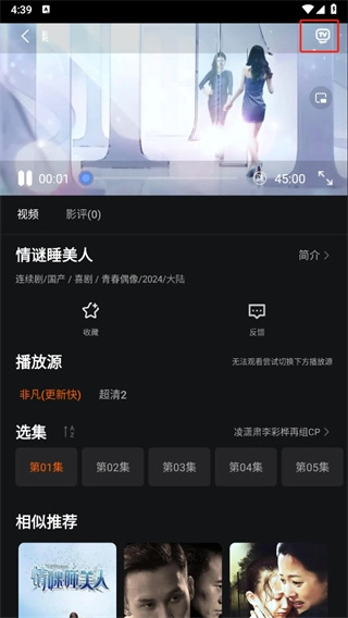 2、在播放详情页点击屏幕任意位置呼出菜单,然后点击“tv”标志。