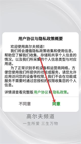 在使用高尔夫频道之前,您需要先阅读《用户协议与隐私政策概要》,在了解其中关于信息收集及权限使用的相关规则后,点击“同意”按钮,这样才能正常使用该软件的各项功能。