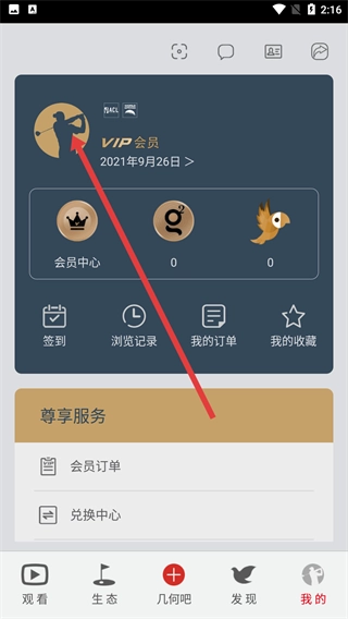 2、进入高尔夫频道主界面后,点击底部的【我的】选项,就能进入个人中心页面,在这里可以查看会员信息、订单记录等各类个人相关功能。