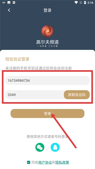 4、进入登录界面后,选择短信验证登录方式,依次输入手机号与验证码,点击【登录】按钮就能完成登录流程;若使用的是未注册过的手机号,在验证通过后系统会自动完成注册操作。
