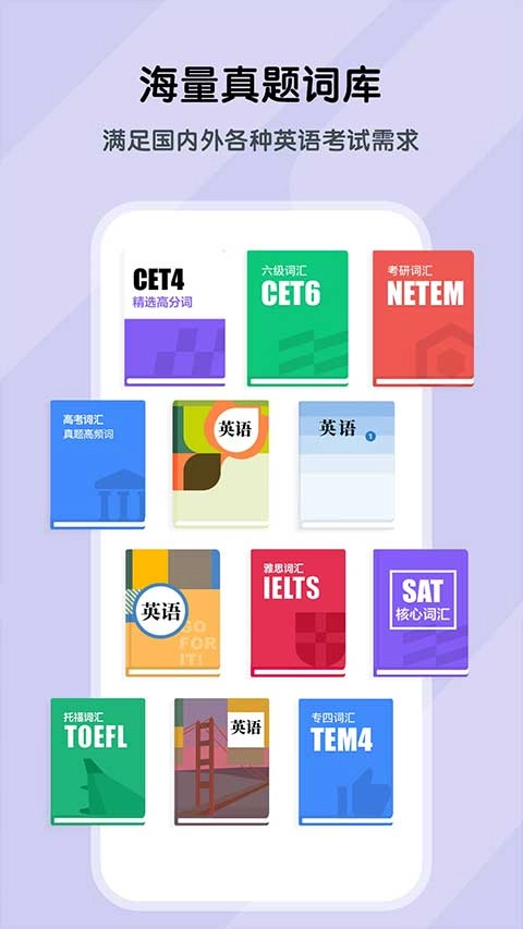 4、海量教材资源:涵盖高考、大学英语四级、大学英语六级、硕士研究生入学考试、雅思、托福等各类经典英语单词词库。