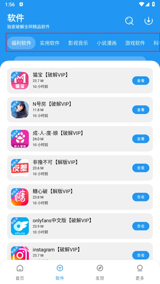 2、进入“软件”板块,这里有实用软件、游戏软件、福利软件等多种类型可供选择。