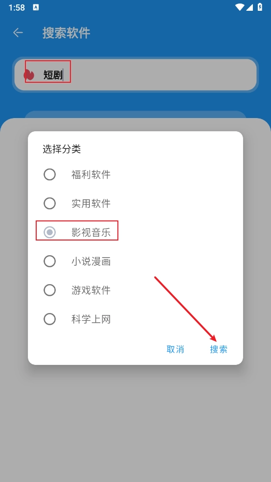 3、也能点击搜索框一键查找心仪的资源,如图所示,选好分类后点击“搜索”按钮即可。