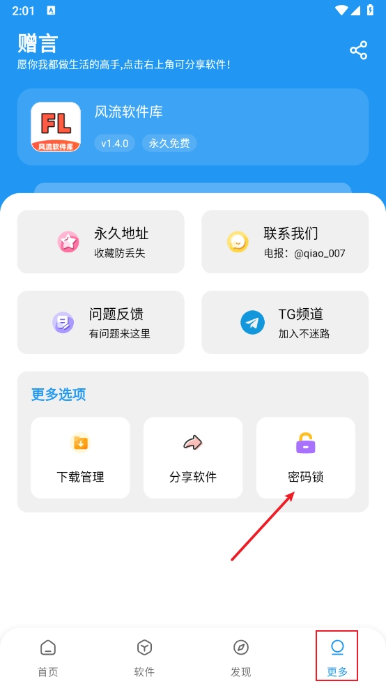 1、打开软件后,找到并点击“更多”板块,接着点击“密码锁”选项进入对应功能界面。