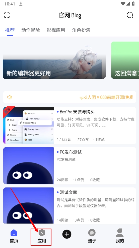 2、进入主页,点击"应用"板块进入。