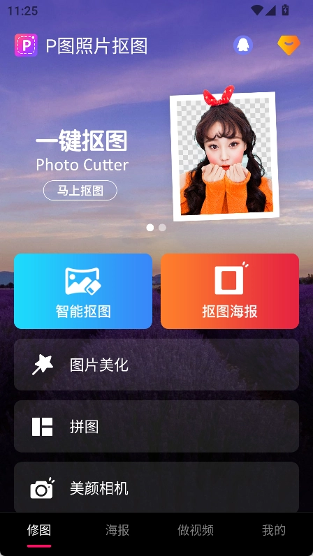在主界面可以看到多个功能选项,例如【修图】页面里的智能抠图、抠图海报、图片美化、拼图等功能。
