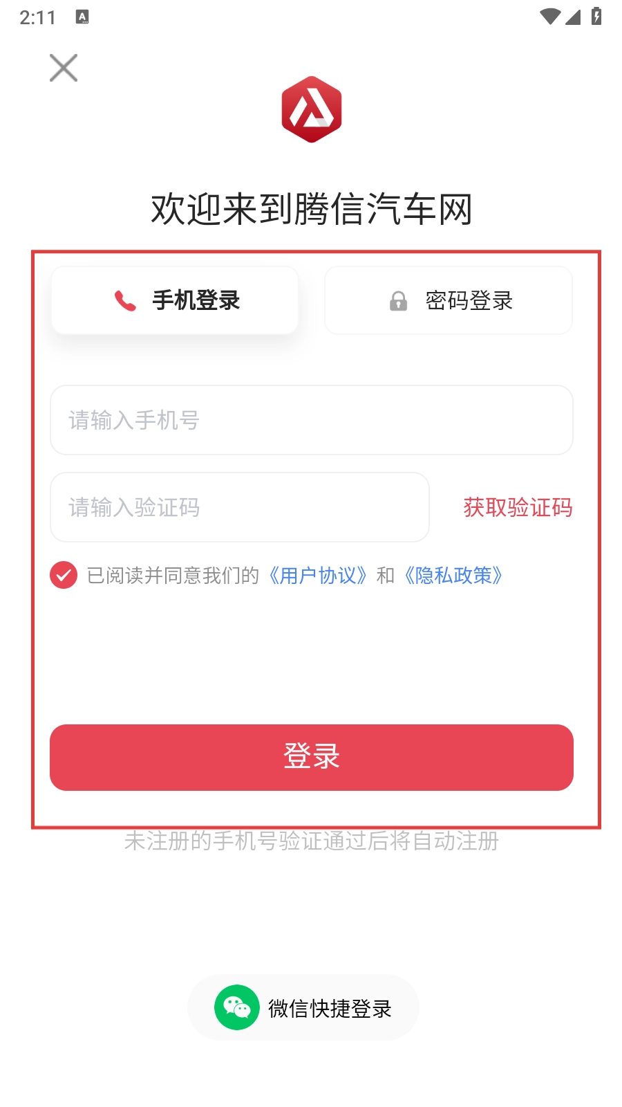 4、若选择【密码登录】方式,需先输入手机号与密码,再点击【登录】按钮;若尚未注册账号,可点击【注册】选项完成账号注册操作。