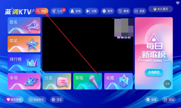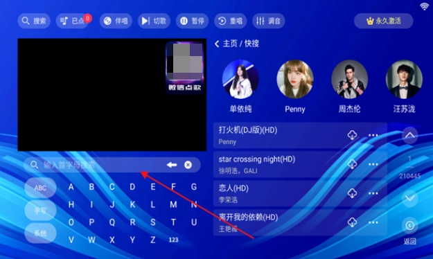 进入主页后点击上方的搜索框,也能通过输入歌名或歌星来点歌。