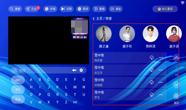 4、在右侧区域就能看到对应的歌手或歌曲,点击相应歌曲就能将其添加到已点列表中,这样就可以排队K歌了。