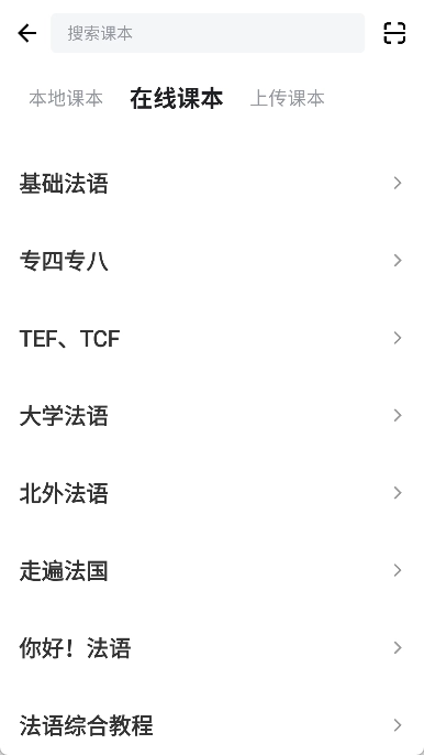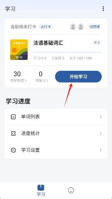 选好课本后,点击“开始学习”按钮就能开始学习法语单词了。
