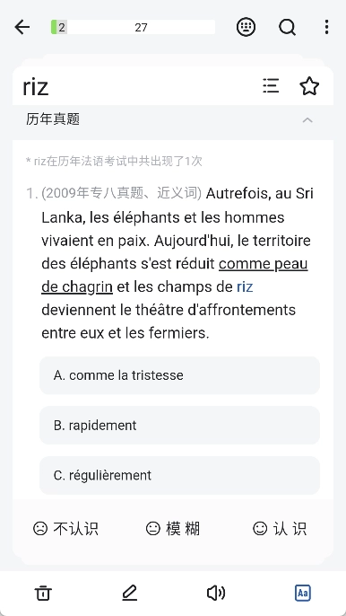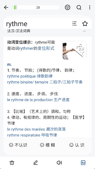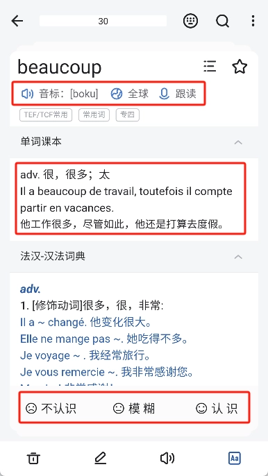 5. 可以查看单词的释义和例句,也可以听发育,在下方选择是否认识。