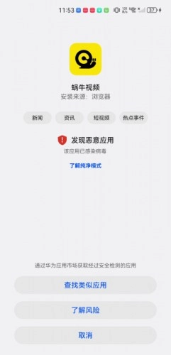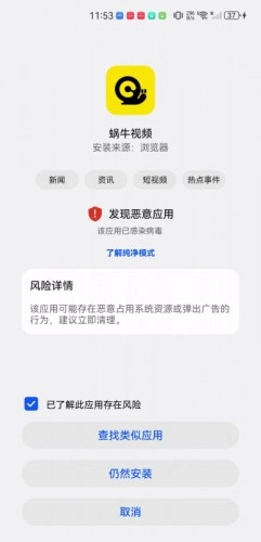 系统检测到恶意应用,这有可能是误判,建议点击“了解风险”。