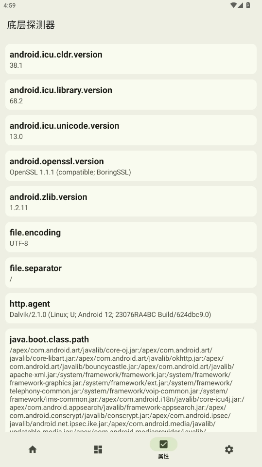 底层探测器就像经验丰富的老中医搭脉问诊,能把安卓设备的“五脏六腑”摸得明明白白。它不搞花里胡哨的噱头,一心扑在底层信息的深挖上——从手机型号、硬件参数、系统版本,到藏在代码深处的隐秘细节,都能一一揪出来。不管你是爱折腾安卓的玩家、想摸清手机配置的用户,还是需要排查系统问题的使用者,它都是趁手的好工具。别再靠猜,直接拥抱真相,让你的安卓设备彻底“透明”起来!