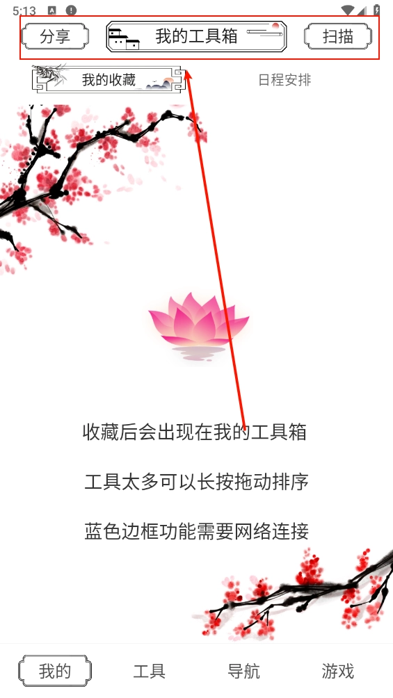 1、首先在本站安装荷花工具箱,之后进入“我的”板块,就能开展分享与扫描操作了。