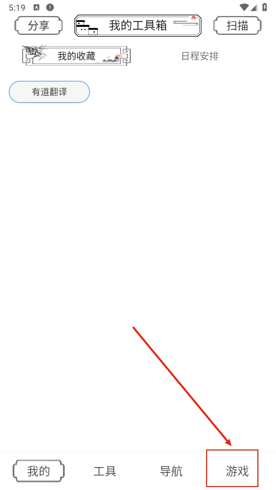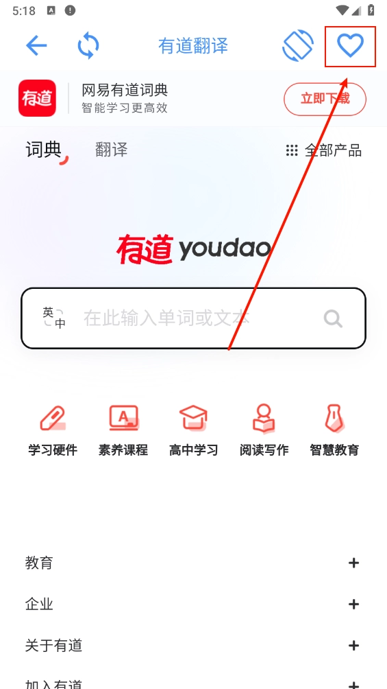 7、例如打开有道翻译,就能直接使用,点击右上角的小爱心完成收藏就好。