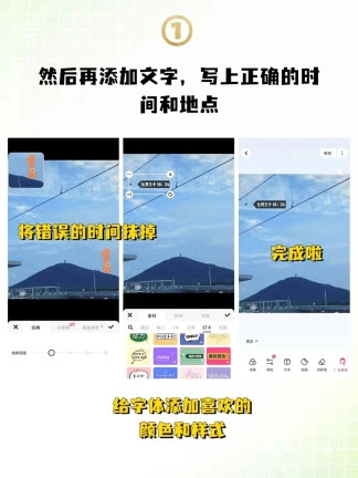 1、使用美图秀秀的消除笔工具去除照片上的时间,接着添加文字,标注出准确的时间与地点