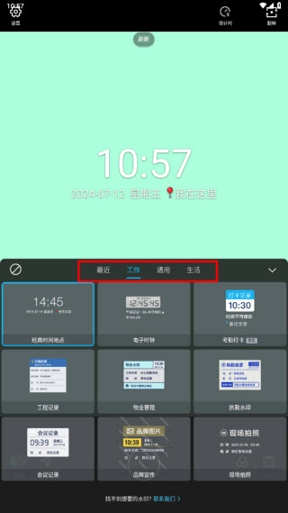 2、进入水印模板选择界面,我们能看到软件提供了生活中常见的各类场景模板,像电子时钟、考勤打卡、执勤水印、现场拍照等。这些模板可通过上方的标签栏进行选择。
