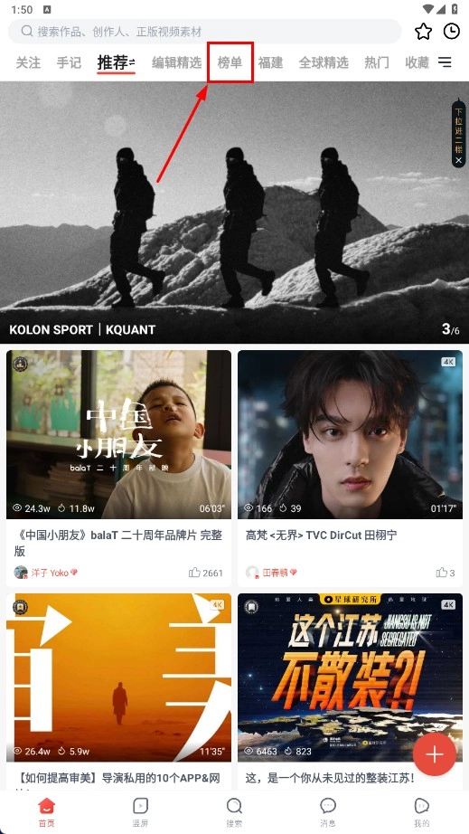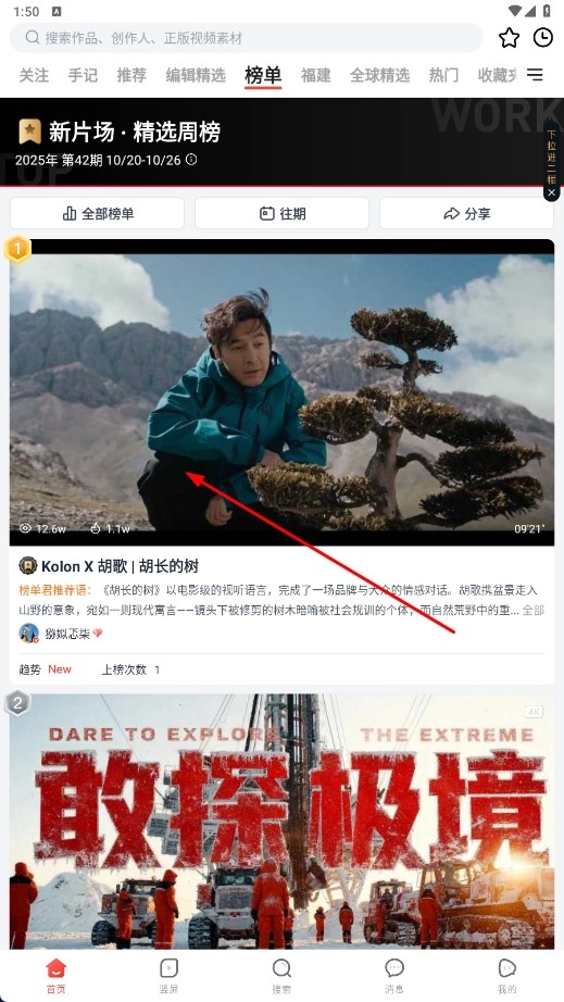 2、在榜单页面挑选自己感兴趣的榜单内容,比如“Kolon-X胡歌|胡长的树”,点击该内容就能进入视频播放页面。