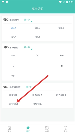 2、在词汇板块中点击【必背短语】选项,即可进入必背短语列表页面。在这里,你能看到高考必背短语的各类分组,有助于进行更具针对性的学习。