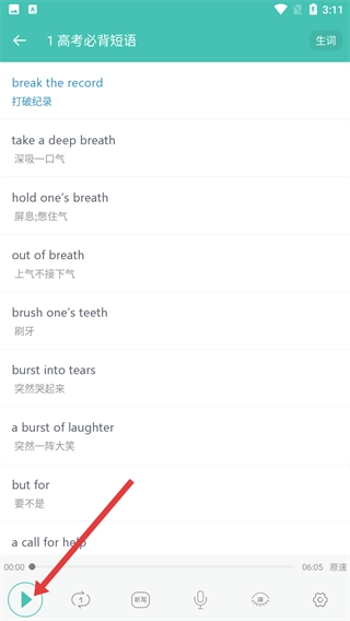 4、进入短语详情页后,点击页面底部的播放按钮,即可收听短语音频;结合像【break-the-record-打破纪录】这类短语的中英释义,能够帮助提升英语短语的听记能力。