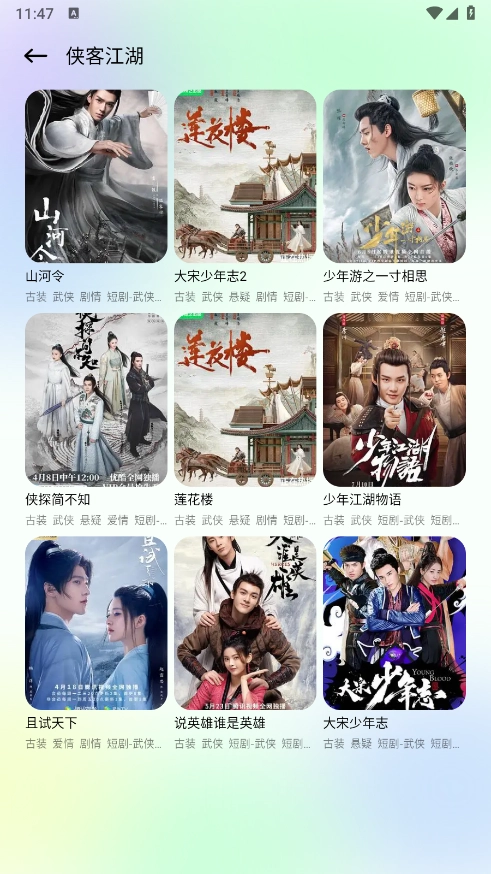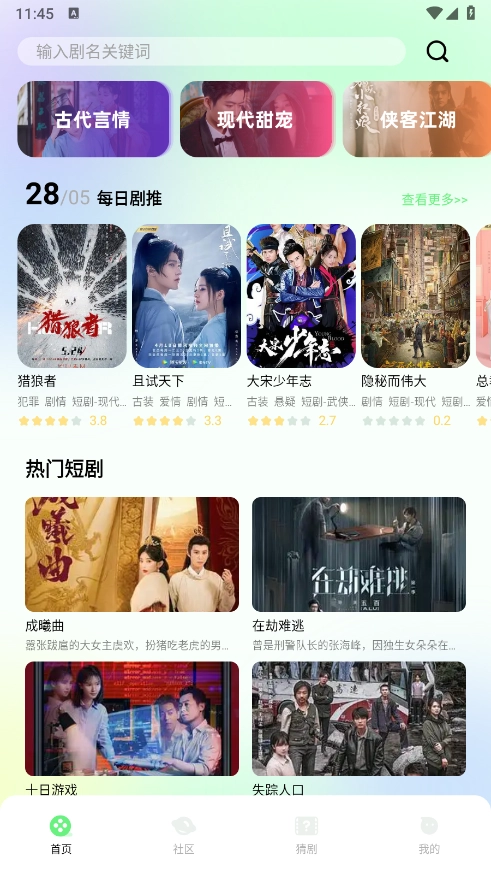 进入首页后,能看到详细的短剧分类,涵盖古代言情、现代甜宠、侠客江湖等类型。
