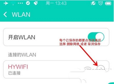 4、打开系统的WIFI列表,把已保存的WIFI热点取消保存,这样就能保证手机不会再自动连接这些WIFI了。