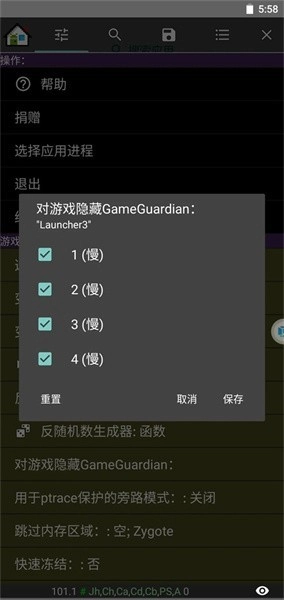 7、游戏隐藏功能针对的是游戏隐藏,其目的在于防止游戏检测到。该功能从1到4级别逐级增强,勾选的选项越多,防检测能力就越强,但搜索速度会相应变慢。不过需要注意的是,防检测并非是万能的。