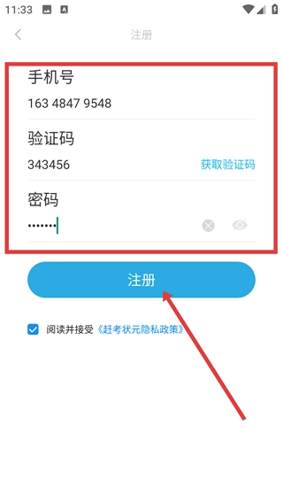 4、进入注册页面后,依次填写手机号、验证码与密码,随后点击【注册】按钮,即可完成账号注册流程。