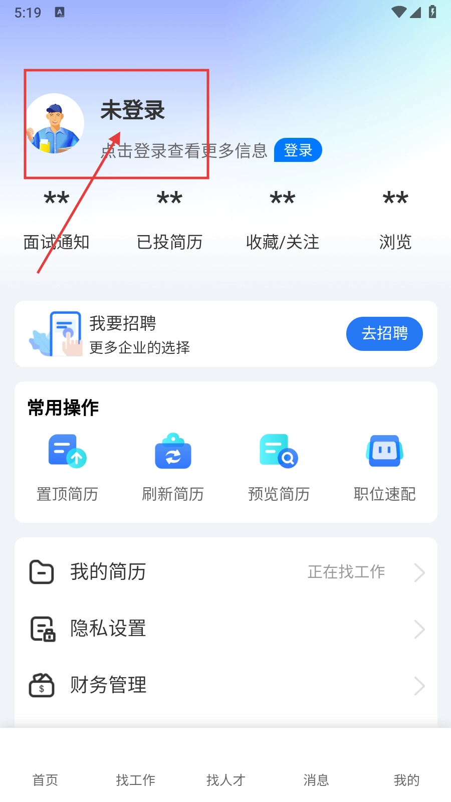 1、在这个求职首页,点击底部的【我的】按钮,就能进入个人中心界面。