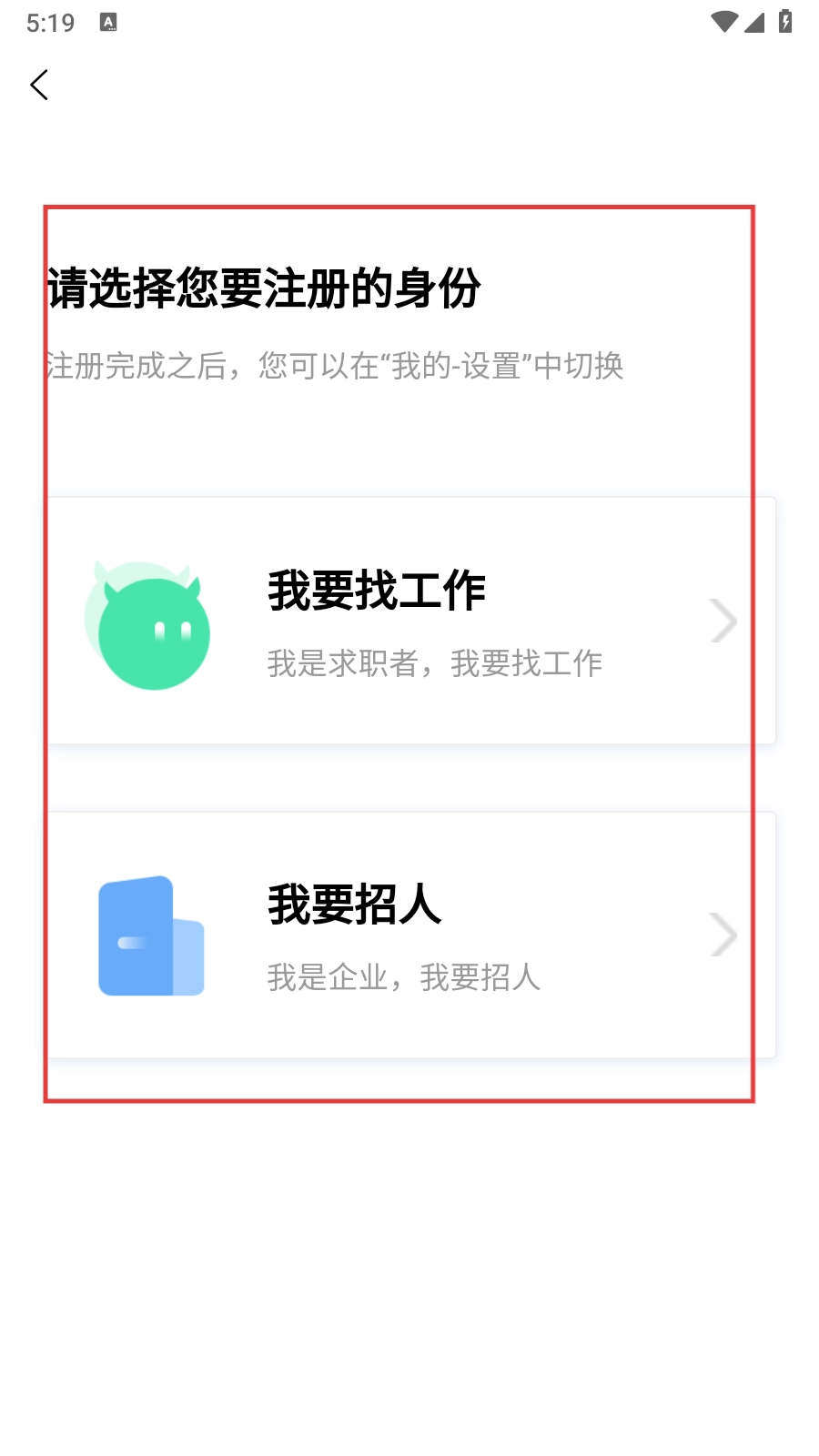4、请选择注册身份:如果您是求职者,可点击【我要找工作】;如果您是企业用户,可点击【我要招人】,这样才能继续完成后续的注册流程。