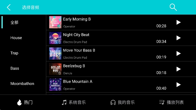5、如图所示,这里有各类音乐资源可供选择,点击右侧的播放按钮就能收听使用。
