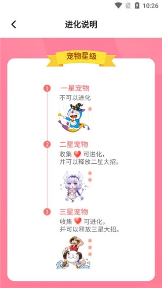 4、部分宠物具备进化能力,只需在互动过程中收集爱心,即可一键完成升级解锁,进而释放宠物大招。