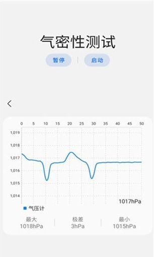 1. 气密性检测:支持暂停与启动操作(便于截图留存),能自动计算测量范围,同时展示压力的最大值和最小值。输入入口位于首页顶部区域,或者“关于手机”页面的右上角图标处。
