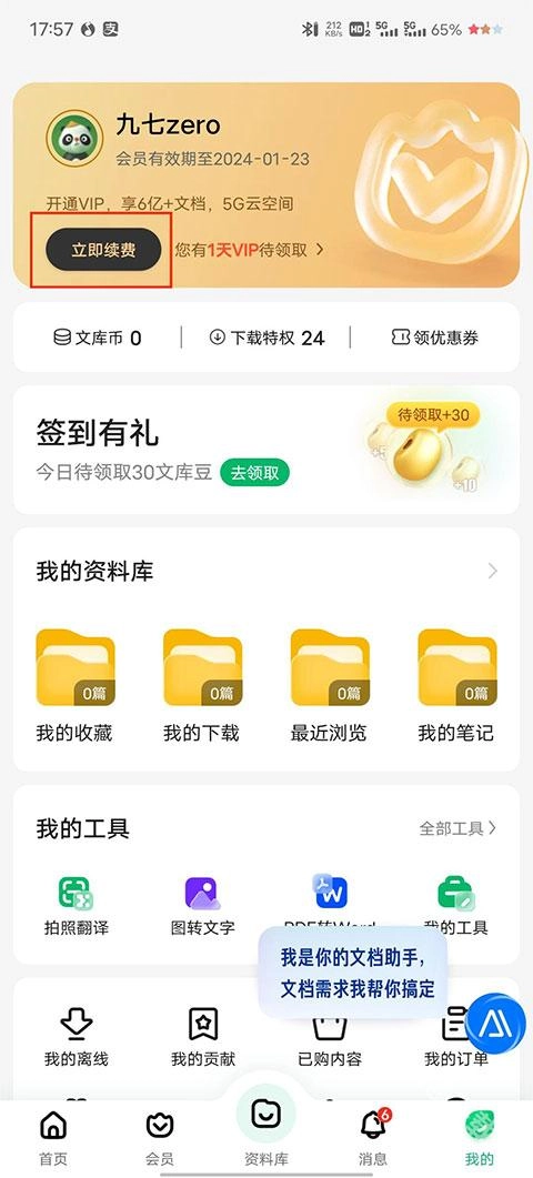1、在我的板块,点击立即续费选项;