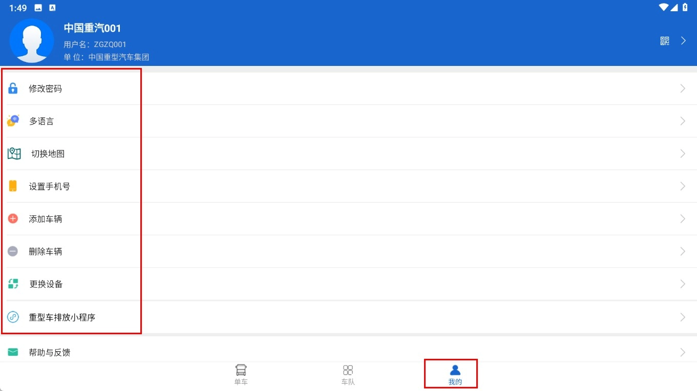 3、点击【我的-功能按钮】,进入个人中心页面后,就能开展修改密码、切换地图、添加车辆等操作。