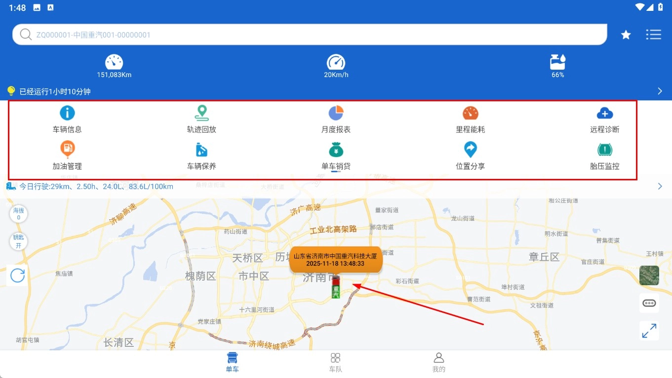 2、点击【车队】功能按钮,进入车队页面后,就能看到总里程、在线车辆数等车队统计信息。