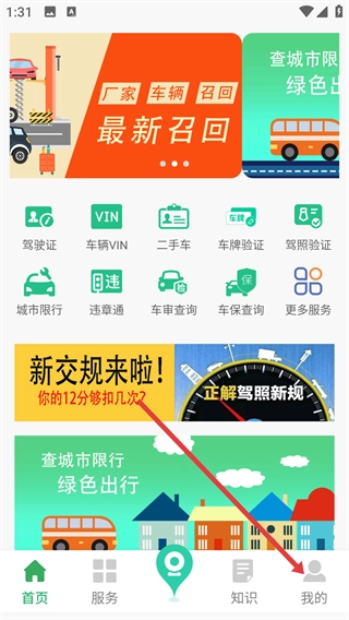 在软件首页,能使用【驾驶证】【车辆VIN】【二手车】等服务,点击右下角的【我的】即可进入个人中心。