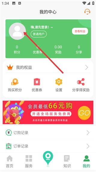 2、进入【我的中心】页面后,点击用户头像所在区域即可执行登录操作;登录成功后,不仅能查看积分、优惠券等相关信息,还可以使用购买积分、优惠券等功能。