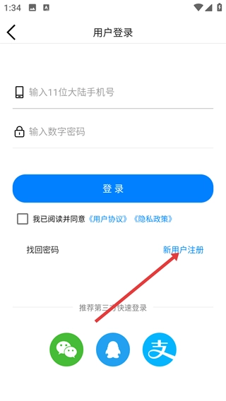 3、在用户登录页面,新用户既可以点击【新用户注册】按钮完成注册,也能够选择第三方快速登录的方式进行登录,不过在登录之前,需要先阅读并同意《用户协议》和《隐私政策》。
