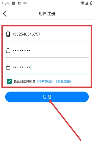 4、用户注册时,需进入注册页面,输入11位中国大陆手机号,设置并确认纯数字密码,勾选同意《用户协议》与《隐私政策》,最后点击【注册】按钮即可完成注册流程。