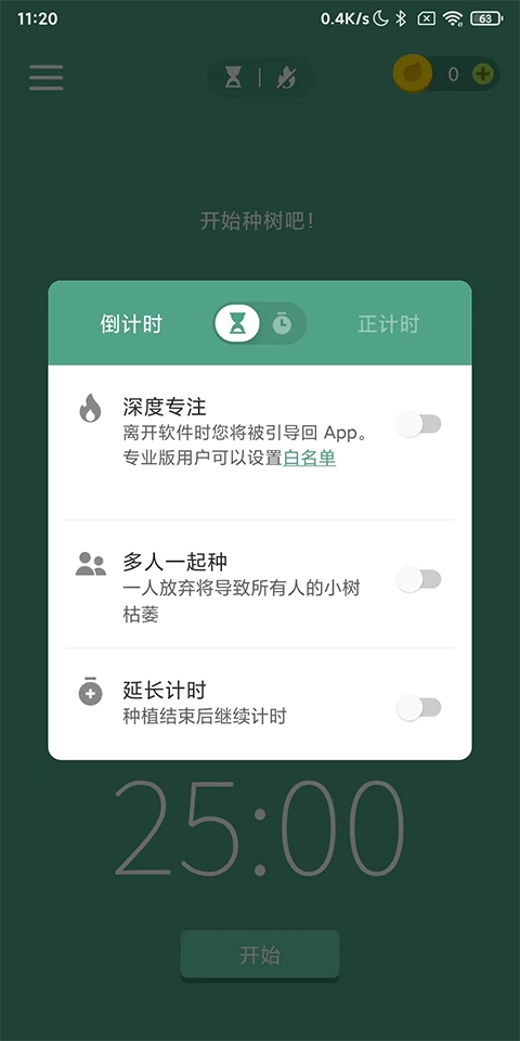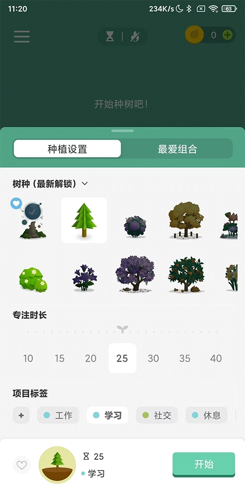 7、个性化设定——支持自定义心仪的树种、专注时长与标签组合,一键即可开启种植,轻松打造专属风格!