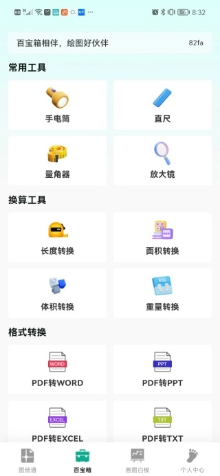 常用工具中包含手电筒、直尺这类实用工具,可满足基础测量需求;换算工具则能一键完成长度、面积等数据的转换,甚至支持将CAD文件转换为PDF格式。