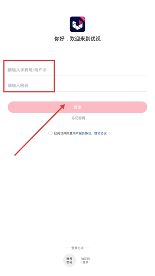 3、在登录页面,可选择“账号密码”登录方式,输入手机号或商户ID以及密码,勾选相关协议后点击【登录】按钮。