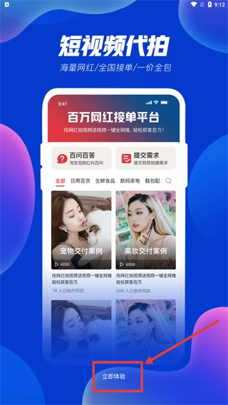 2、在短视频代拍推广页面,点击【立即体验】按钮,即可进入应用的主流程。